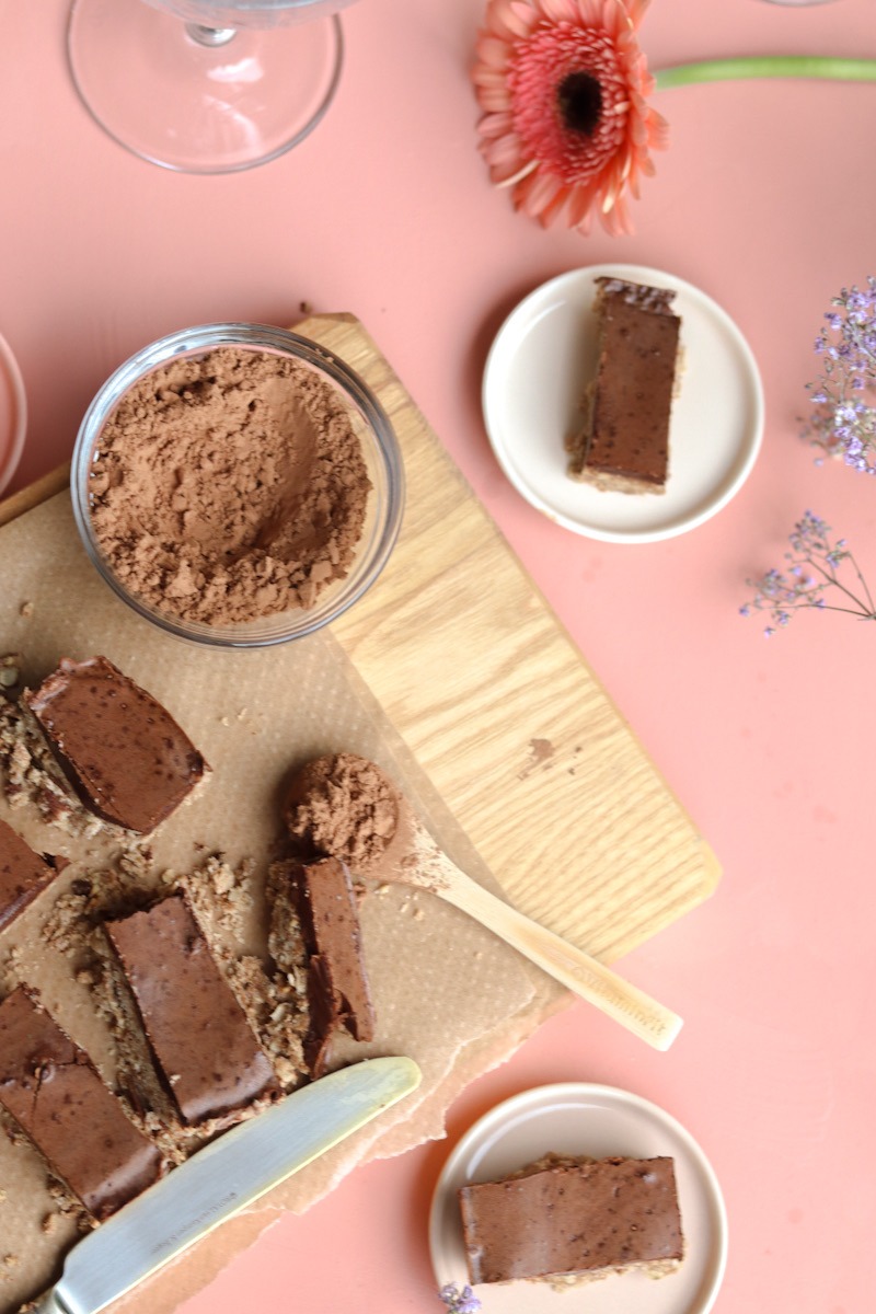 In zowel de vulling als het chocoladelaagje bovenop zitten weinig suikers. In de vulling zit een beetje ahornsiroop en in de topping een beetje kokosbloesemsuiker. Voeg gerust wat extra’s toe als je dat lekkerder vindt, proef dus ook zeker tijdens het maken!