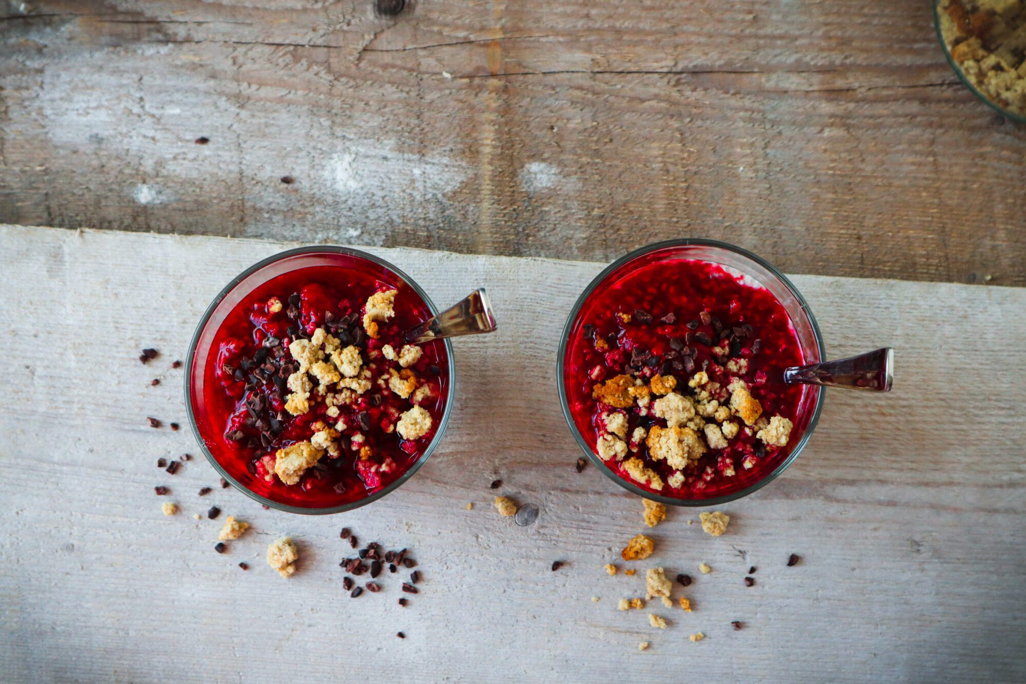 Haal de volgende ochtend de glazen en de frambozen uit de koelkast, en verdeel de frambozenjam over de chiazaad-bananenpudding. Top dit af met kokosrasp en cacaonibs.
