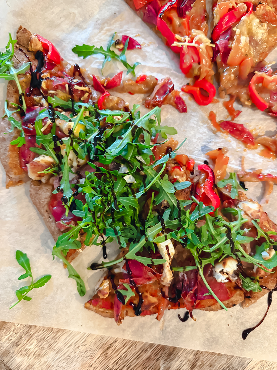 Haal uit de oven en leg op een grote snijplank. Snij de pizza in slices en verdeel de rucola erover. NOG lekkerder met een drizzle balsamico creme. Geniet!