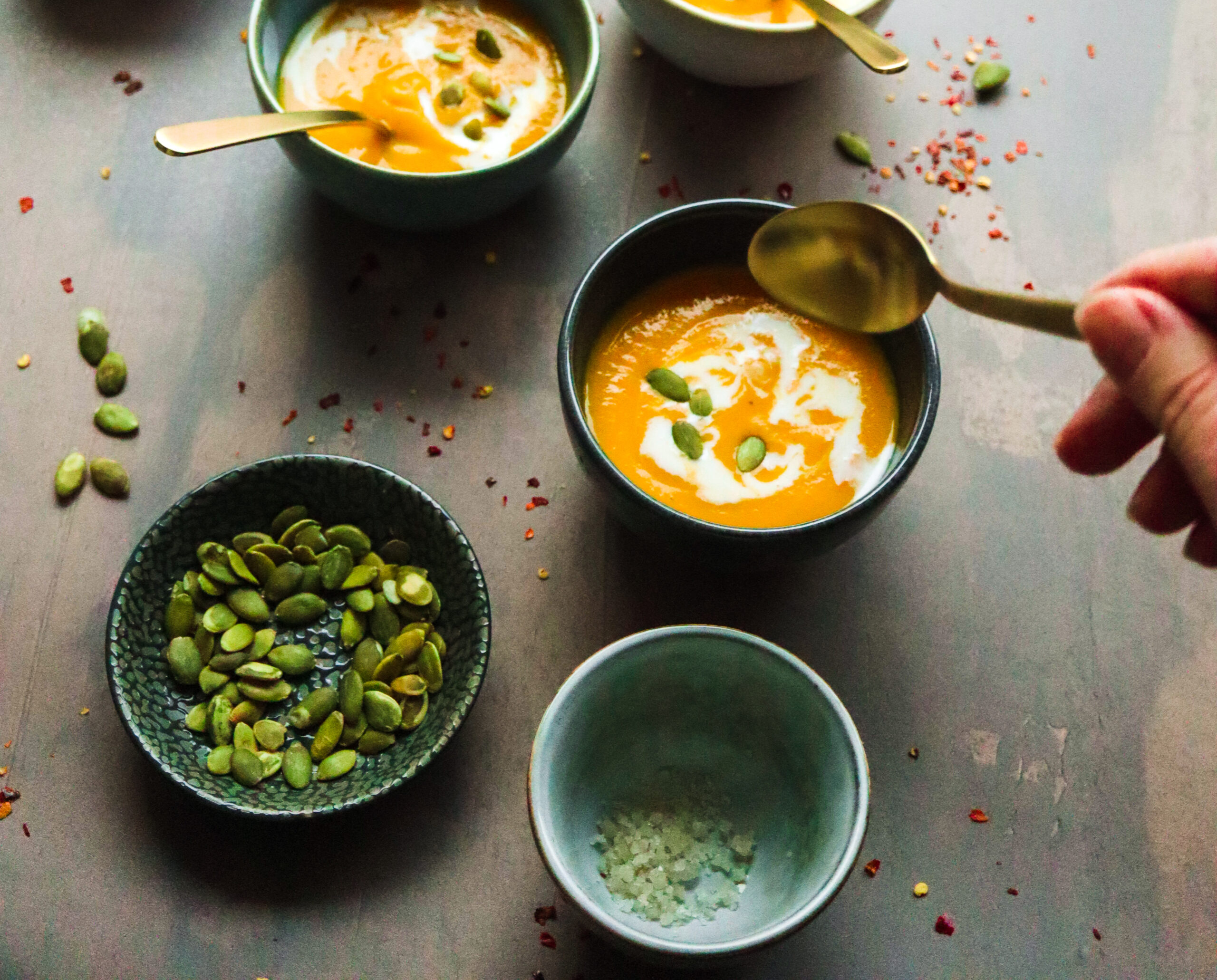 Ook zonder de kokosroom en pompoenpitten is deze soep heerlijk trouwens.