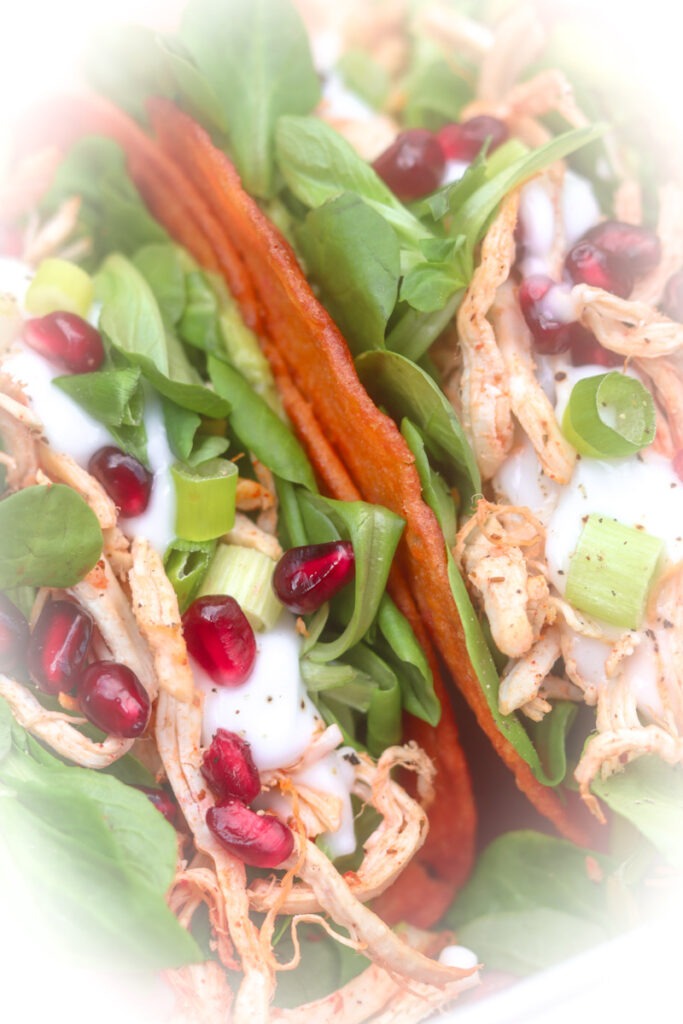 Ik maak ze vaak met pulled chicken (heel lekker en superhandig als je al iets in de koelkast of vriezer hebt). Maar: varieer gerust, graag zelfs!